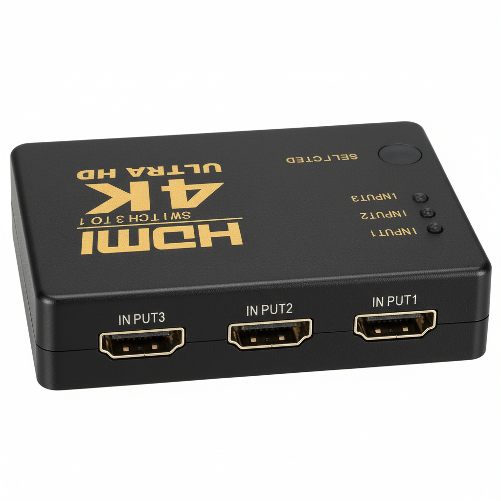HDMI Switch 3 to 1 Ultra HD 4K HDMI 2.0 Switch with IR Remote Control.